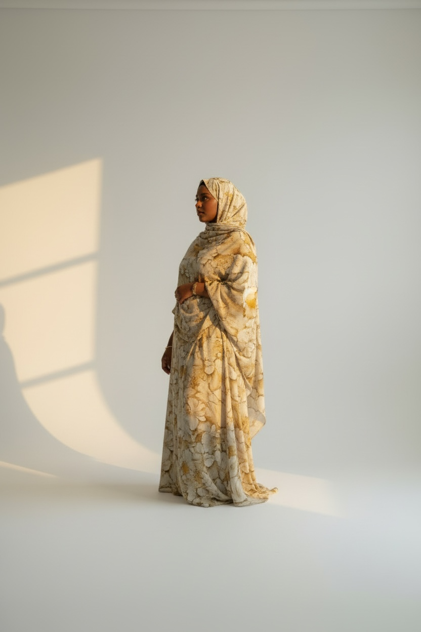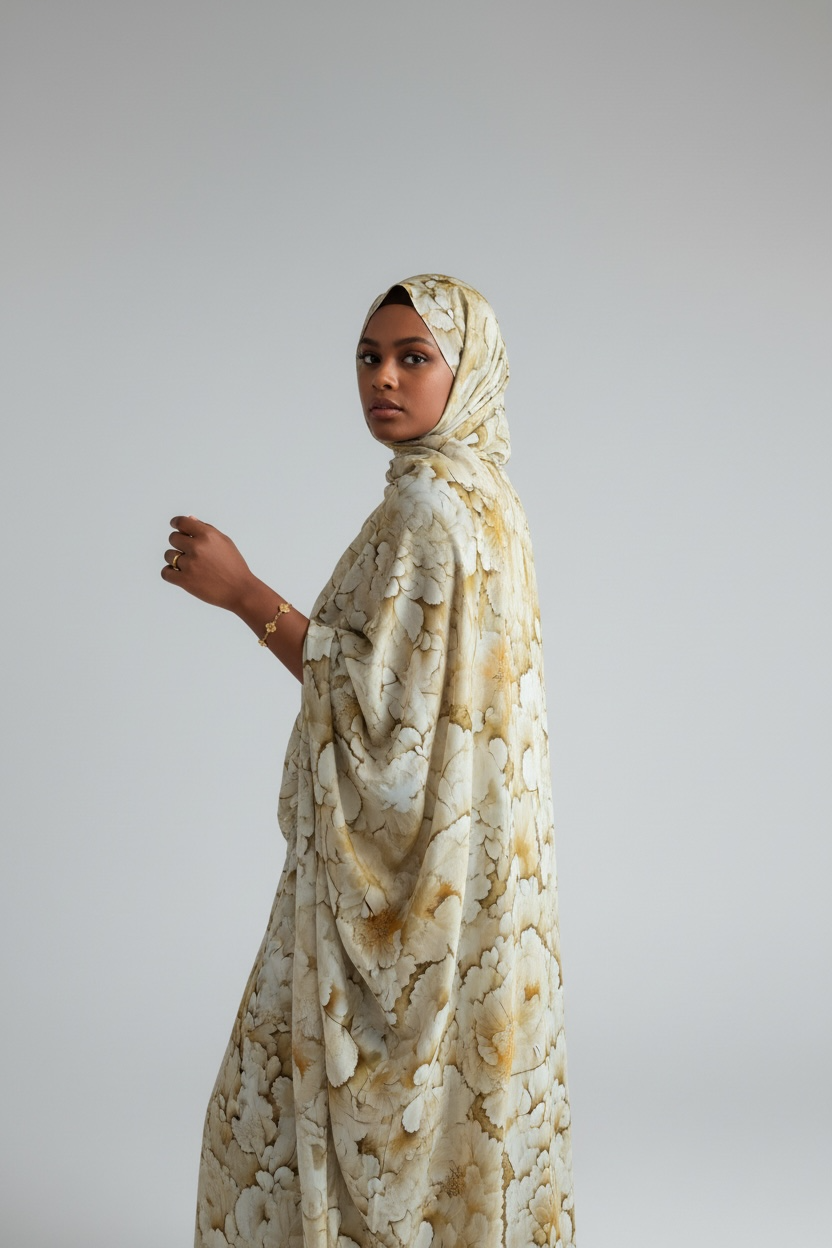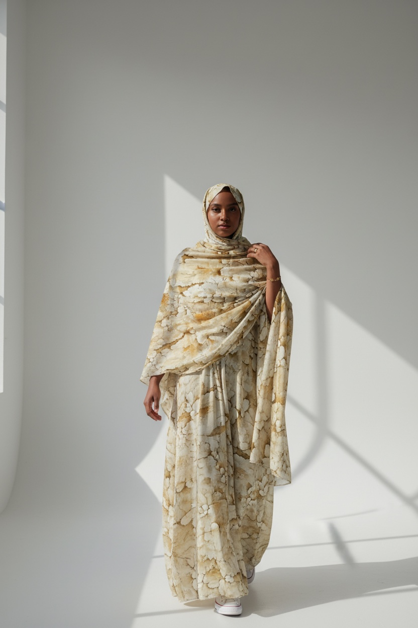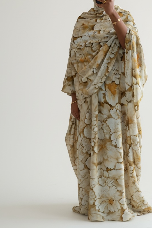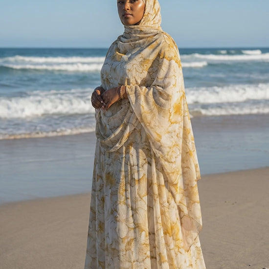Light and serene, the Noor Dera features a soft cream base with subtle marbled detailing in warm neutral tones. The airy palette and flowing silhouette create a timeless, modest look that feels peaceful and elevated.