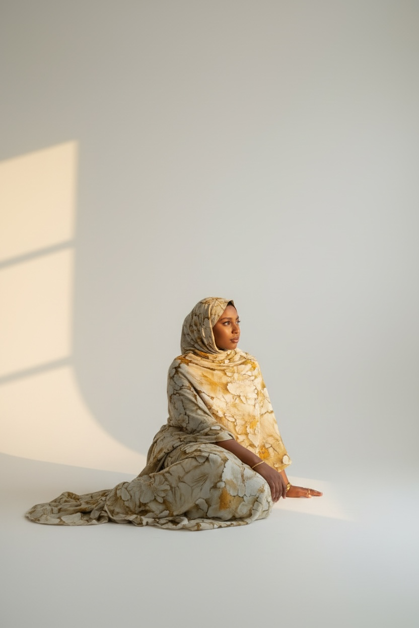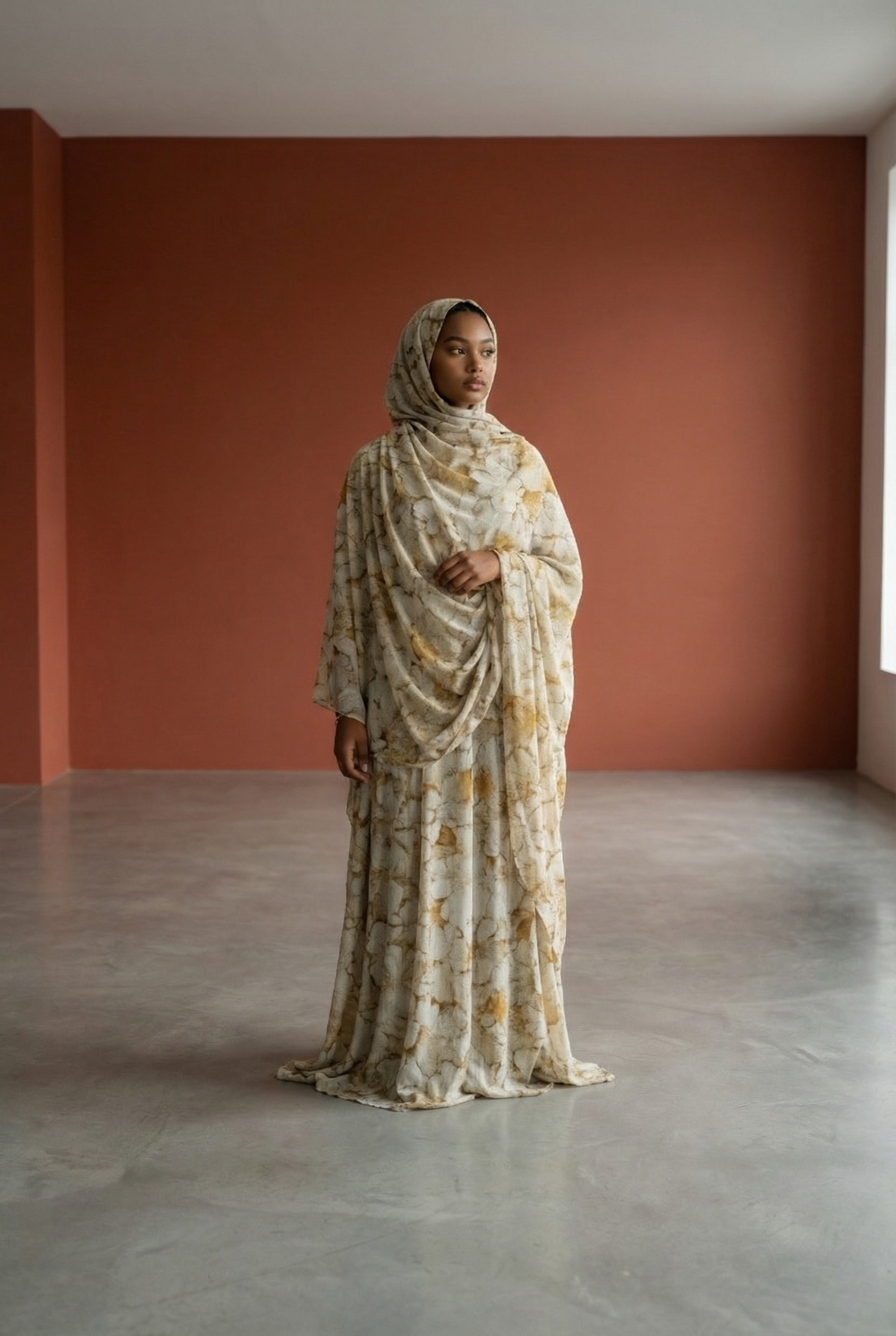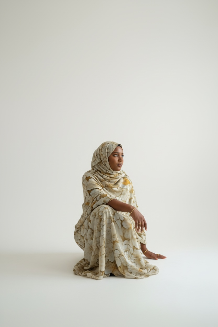 Light and serene, the Noor Dera features a soft cream base with subtle marbled detailing in warm neutral tones. The airy palette and flowing silhouette create a timeless, modest look that feels peaceful and elevated.
